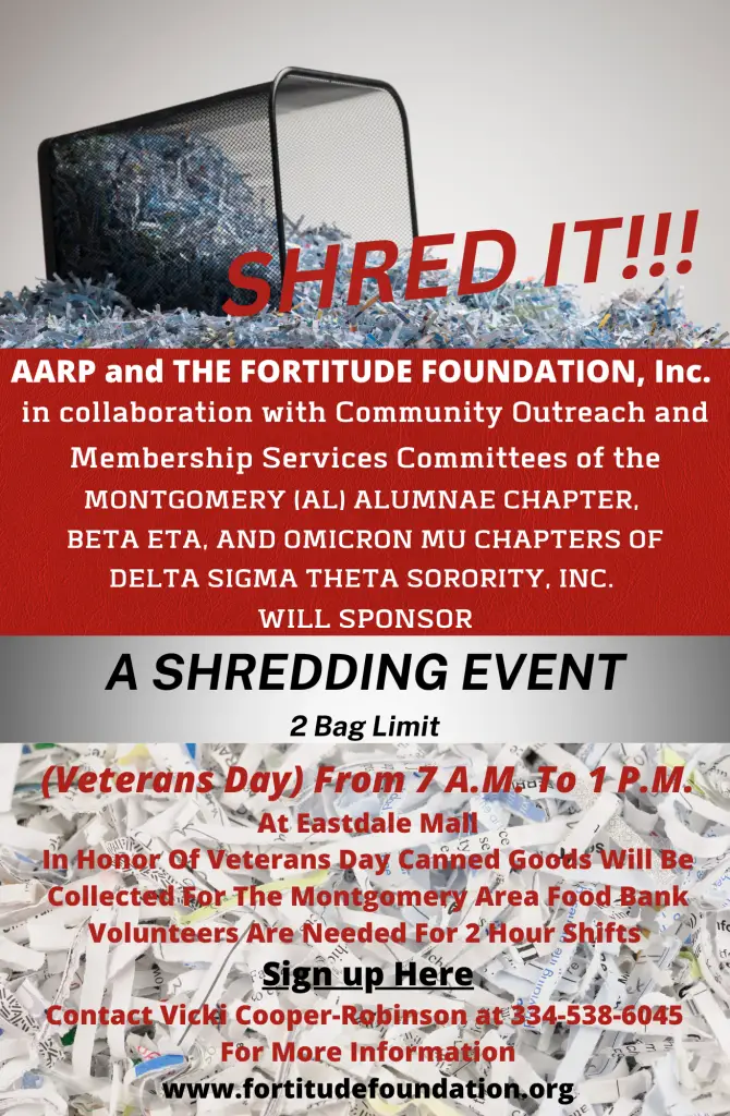 Eastdale Mall 1000 W Eastdale Mall, MontgomeryProtect Your Identity: Free Shredding Event with AARP & The Fortitude Foundation Join AARP and The Fortitude Foundation for a free community shredding event designed to help you safely dispose of sensitive documents and protect against identity theft. Bring your old bills, bank statements, medical records, and other personal paperwork — and we’ll shred them on-site, securely […]